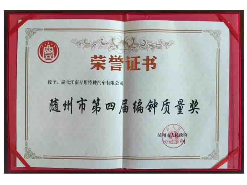 湖北江南專(zhuān)用特種汽車(chē)有限公司經(jīng)過(guò)申報(bào)推薦、資格審查、資料評(píng)審、現(xiàn)場(chǎng)評(píng)審、問(wèn)詢(xún)答辯、綜合評(píng)價(jià)、審議公示等程序,被授予“隨州市第四屆編鐘質(zhì)量獎(jiǎng)”。