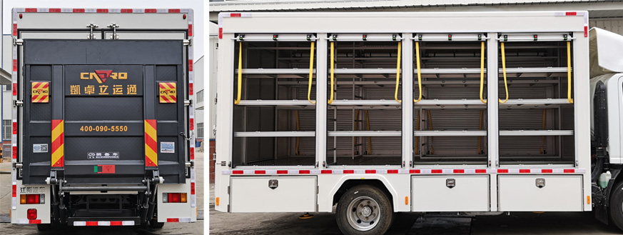 JDF5100XZBQ6型裝備車由底盤、液壓搭橋(尾)板、器材箱等組成,內(nèi)部設(shè)置隔間,可根據(jù)運(yùn)輸設(shè)備的外形尺寸及特點(diǎn)固定、安裝,用于后勤保障,向一線輸送特種裝備。該車系選用慶鈴汽車股份有限公司生產(chǎn)的QL1110ANKAY二類汽車底盤改裝而成,原裝單排駕駛室,可載含駕駛員在內(nèi)的乘員3人,駕乘舒適輕便。該車用于消防救援隊(duì)裝備運(yùn)輸,兩側(cè)卷簾門,車尾安裝搭橋板或1噸垂直升降液壓尾板,搭橋板主要用于機(jī)器人上下車廂;貨物可通過液壓圍板上下車,內(nèi)部根據(jù)轉(zhuǎn)運(yùn)器材的結(jié)構(gòu)進(jìn)行鋁合金器材架的搭建,該車最大的特點(diǎn)是操控性好、維修簡(jiǎn)便,可廣泛應(yīng)用于應(yīng)急消防隊(duì)、公安、醫(yī)療衛(wèi)生、廠礦企業(yè)及社區(qū)、碼頭等場(chǎng)所。