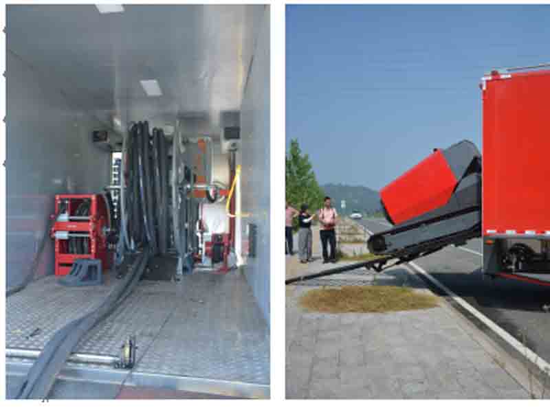 移動(dòng)排水泵站及液壓系統(tǒng)放置室:車廂中段用于停放液壓裝置、液壓油箱及放置油管絞盤。車廂后門為下開式,行車時(shí)作為后門,保護(hù)車內(nèi)設(shè)施,當(dāng)子車下車時(shí),可作為其階梯,使子車平穩(wěn)上下車。
